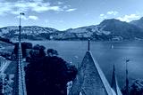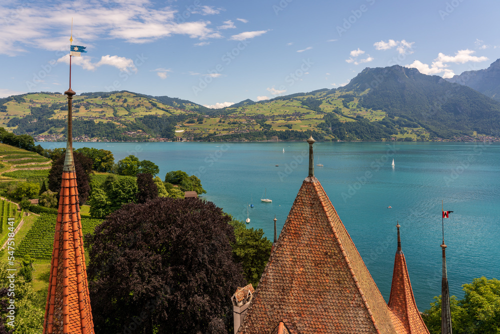 Panoramic view of Spiez and Lake Thun in Switzerland.
