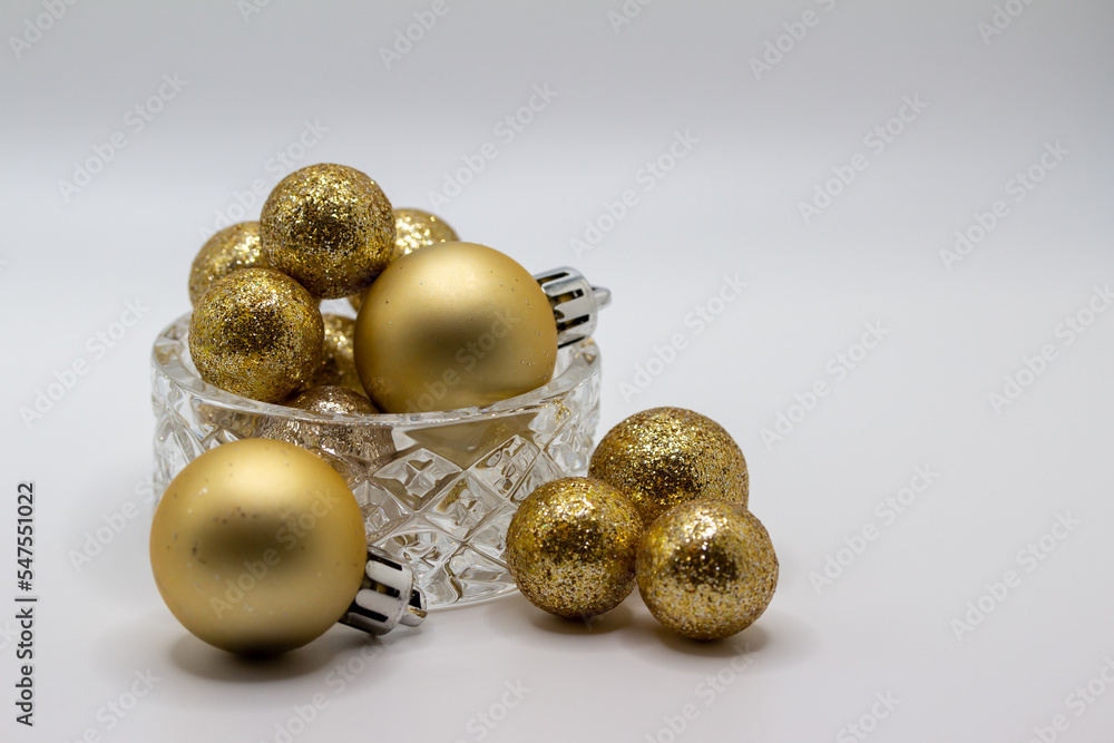 Macro abstract defocused view of a beautiful small crystal bowl with sparkling glitter holiday balls, with white background