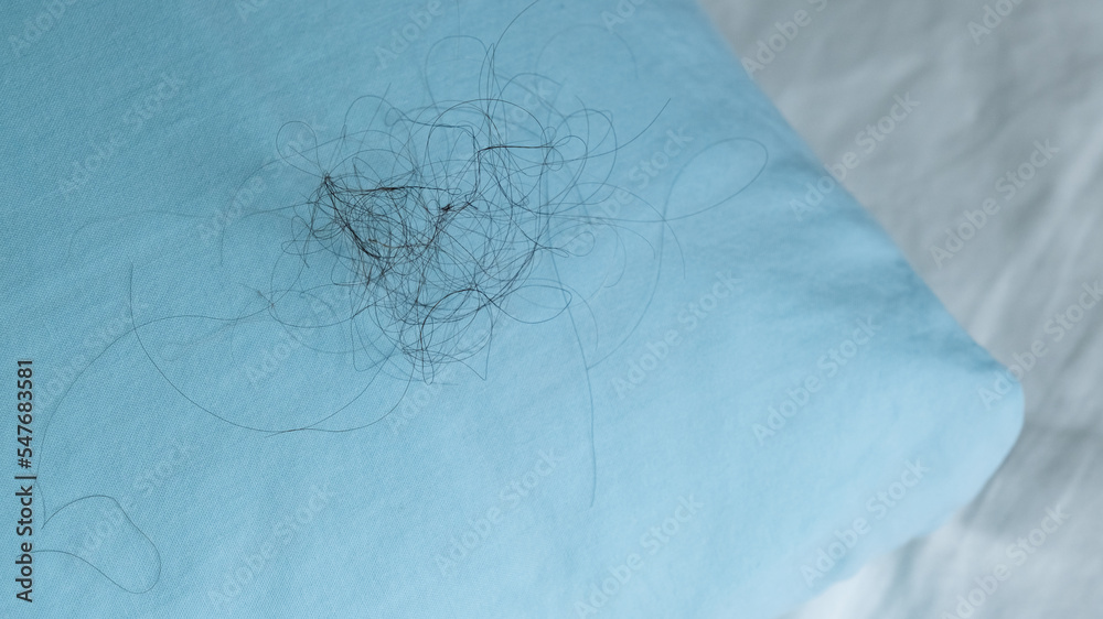 Fallen long hair on the blue pillow. Baldness and hair loss problem