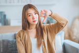Dislike. Upset young asian woman showing thumbs down sign gesture in living room at modern home apartment, disappointment concept.