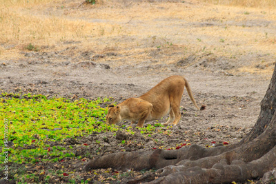 Lioness (Panthera leo) drinking water from waterhole in Tarangire national park, Tanzania