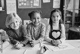 Three intercultural little kids in casualwear with cheerful African American girl in center looking at camera while standing by desk