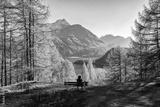 Silhouette of a person on a bench who is enjoying the view of the golden larch trees near Lake Sils. Engadin valley in Graubünden canton, Switzerland.