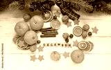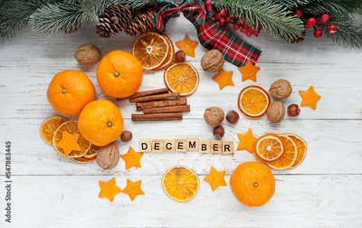 Christmas background. tangerines, dried orange slices, nuts, cinnamon, festive decor and letter "december" on white wooden table. December month calendar concept. top view