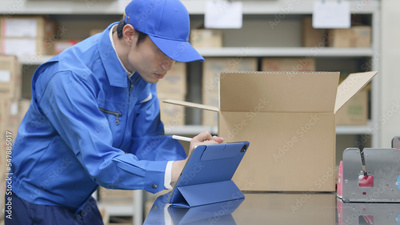荷物を検品してタブレットPCでチェックする男性