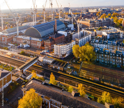 Aerial view of Kensigton Olympia West London in autumn, England