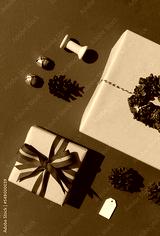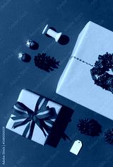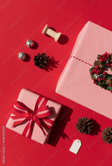 Christmas or New Year pink gift boxes concept composition. Winter holiday greeting card. Top view