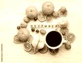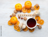 Tea cup and tangerines, dried orange slices, nuts, paper toys and letters "December" on white wooden background.