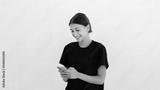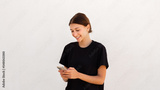 Portrait of happy young woman reading or texting message over white background. Caucasian woman wearing black T-shirt using mobile phone. Mobile communication concept