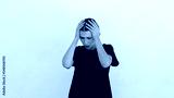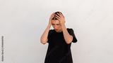 Portrait of desperate young woman holding head in hands over white background. Caucasian woman wearing black T-shirt getting in trouble. Despair and frustration concept