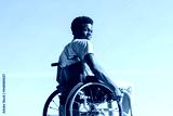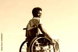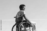 Black man in wheelchair enjoying sunny day in park, looking back and smiling at camera over the shoulder. Young African American guy with disability having fun outdoors. Disability, motivation concept