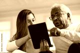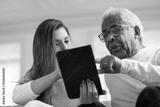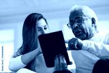 Close-up of aged man and daughter with digital tablet. Happy old man resting at home and young woman explaining how to use tablet for internet. Taking care of old people, modern technologies concept