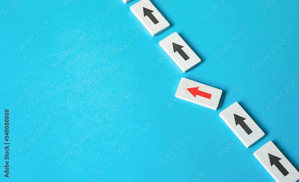 One arrow changes direction from the row. Detachment and uniqueness. Alternative path. Conformism denial. Atypical thinking leadership qualities. Run from routine. New experience and opportunities.