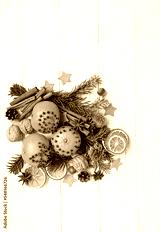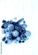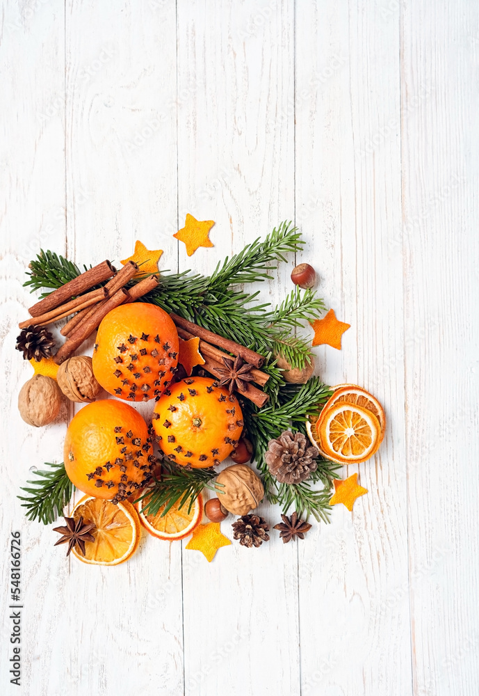 Christmas decor with dried orange slices, nuts, spices, fresh oranges decorated cloves on wooden table close up. Christmas holiday. festive winter season. top view