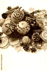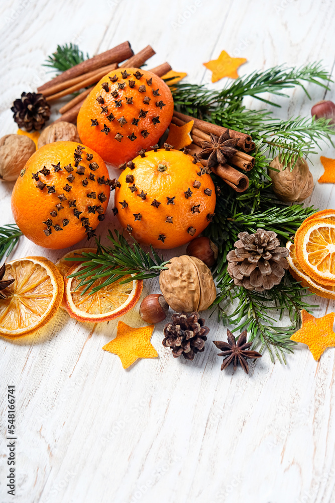 Christmas decor. dried orange slices, nuts, spices, conces, fresh oranges decorated cloves on wooden table close up. Christmas holiday. festive winter season.