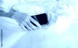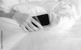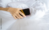 Woman sleeping in bed and hand holding mobile phone. Woman using smartphone in bedroom. Asleep with smartphone. Work life imbalance. Unhealthy sleeping. Social media addict. Need social detox concept.