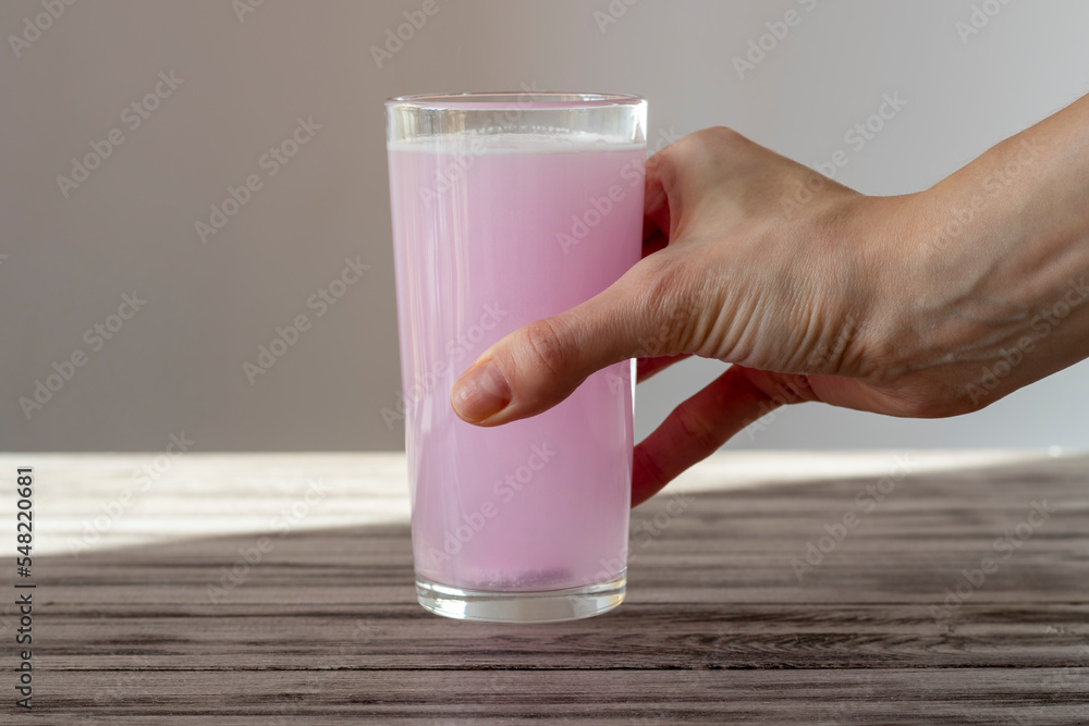 Electrolyte tablet is dissolved in water. Female hand holds a glass of rosewater. Oral rehydration salts for athletes.