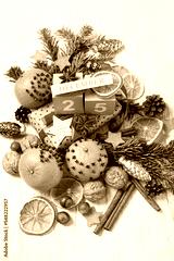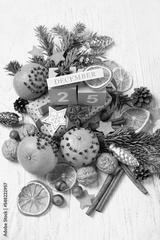 Christmas background. Gift box, 25 december date calendar, fir branches, toys, cinnamon, oranges decorated cloves on wooden table close up. Christmas holiday. festive winter season.