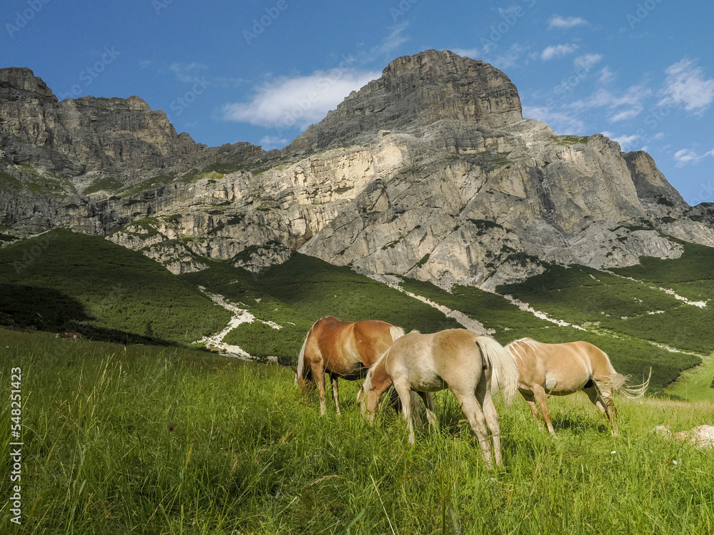 horses on grass in dolomites mountains background