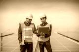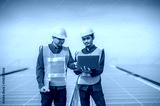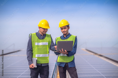 Team Asian Engineer standing on rooftop factory and checking solar power solar cell energy by tablet technology.