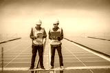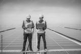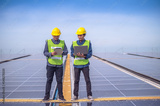 Team Asian Engineer standing on rooftop factory and checking solar power solar cell energy by tablet technology.