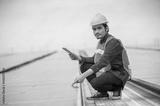 Asian Engineer checking solar power cell energy on rooftop of factory. Asian worker working install solar power solar cell system for using clean solar energy.