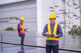 Asian engineer teamwork success standing happy in job working install on rooftop factory solar power solar cell energy.