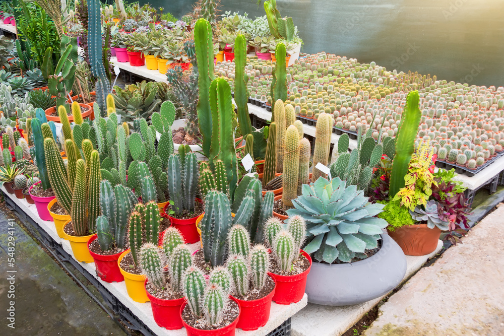 Euphorbia, kalanchoe, agave, prickly pear, cereus, stetsonia, cleistocactus, echinopsis and many other cacti succulents in a greenhouse for growing indoor plants. Business for sale, selection, export.