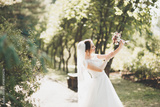 Bride holding big and beautiful wedding bouquet with flowers