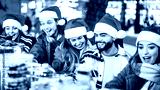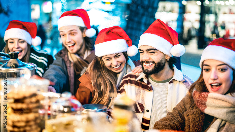 Happy trendy friends having fun shopping at Christmas market - Winter holiday concept with young people hanging out together by candy shop wearing red santa hats clothes - Bright vivid contrast filter