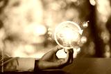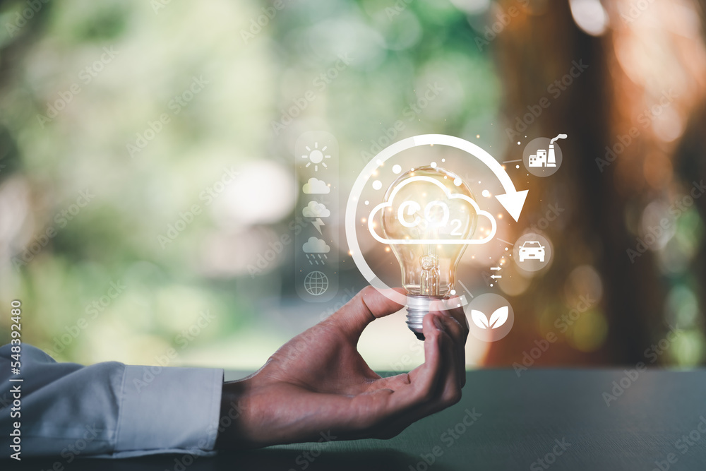 Industrial emissions pollute environment and ecology.including climate change,Carbon Reduction Agreement from Renewable Energy Reduce greenhouse gas emissions,Human hand holding a light bulb
