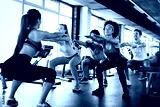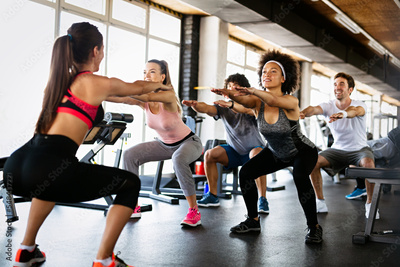 Multiethnic group of people training in a gym. Trainer and sportive fit persons exercising