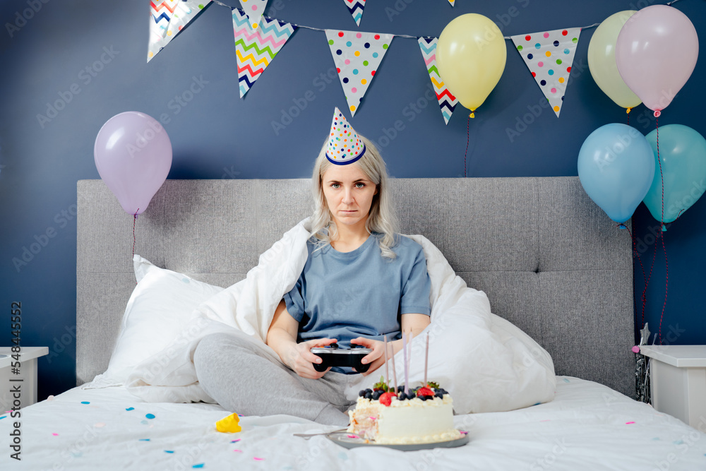 Sad, bored woman in pajamas and party cap playing video games with console alone while sitting on a bed in a decorated bedroom. Celebrates a birthday alone. Boring home party. Selective focus