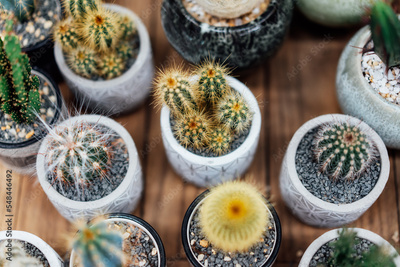 Collection of various cactus plants in different pots in the plant store. Potted cactus house plants. Fashion trend in home design. Home gardening concept. Biophilia. Selected focus