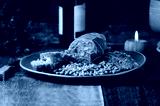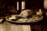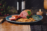 Festive Cristmas Italian Cotechino with lentils on blue plate.