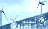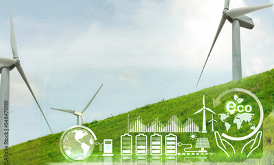 Wind energy. Sustainable and renewable energy. Wind turbines generate electricity. Windmill farm. Sustainable resources. Sustainable development. Rechargeable battery charging with green power concept