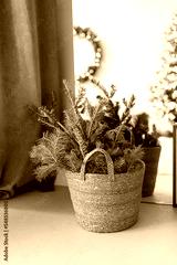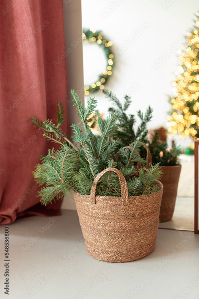 Beige straw basket with fir in room close up. Christmas festive decoration concept greeting card
