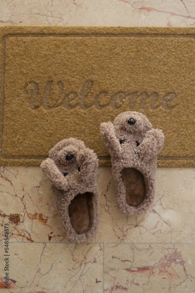 beautiful, warm, house slippers in the form of dogs, stand at the entrance on a home rug. welcome