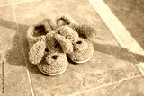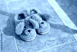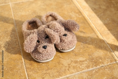 beautiful, warm, house slippers in the form of dogs, stand at the entrance on a home rug. welcome