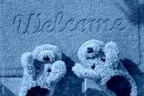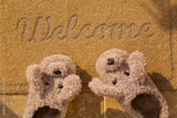 beautiful, warm, house slippers in the form of dogs, stand at the entrance on a home rug. welcome