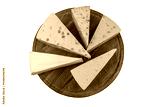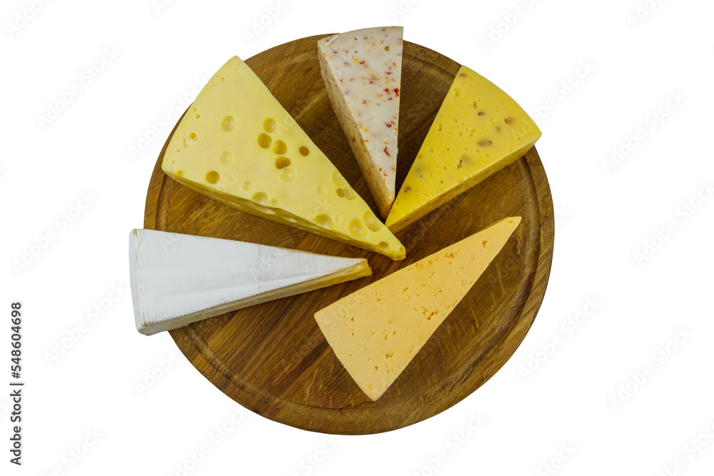Set of various types of cheese on wooden cutting board isolated on white background. Top view