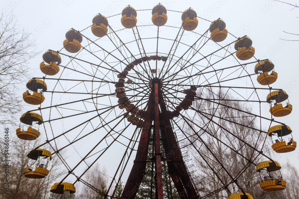 Abandoned Ferris Wheel in the amusement park of ghost town Pripyat in Chernobyl Exclusion Zone, Ukraine