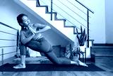Young asian woman doing low lunge twist yoga pose at home. Parivrtta anjaneyasana home yoga practice.