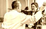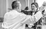 Happy patient and doctor, rehabilitation after injuries, male physiotherapist raising hands of active senior woman in hospital, Musculoskeletal Pain Therapy and Rehabilitation Concept for Senior