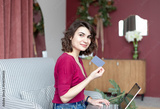 Young woman holding the credit card and sitting on the armchair with laptop on her knees in room with Christmas decorations. Winter holiday gifts online order and internet shopping concept