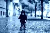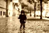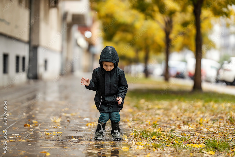 A boy in raincoat and boots is playing on the street and jumping into puddle on the street.