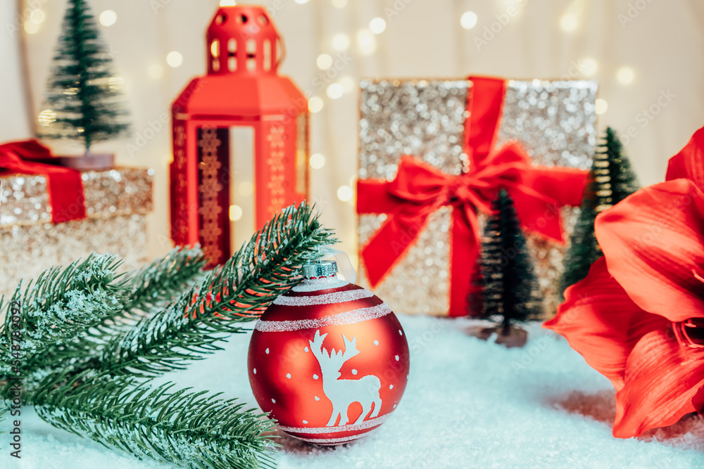 Festive composition with golden gift box, fir tree branch, red ball decor, small Christmas trees, lantern on the snow with warm lights bokeh background. Merry Xmas and Happy new year. Selective focus.