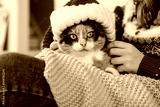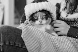 Close up Serious multicolored Cat in Santa Hat lying on the plaid and the female owner knees. Christmas and winter holidays home time. Xmas animals. Selective focus.