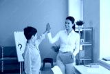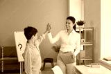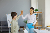 Woman professional psychologist high five with smile to teen boy her patient on the end of therapy session. Psychological help, psychotherapy, therapy, support for teens concept. Child psychologist.