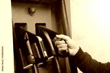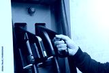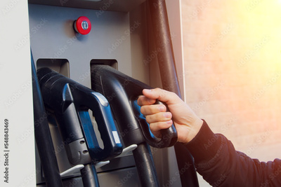 Man's hand takes a pistol for charging an electric car at a recharging station.
